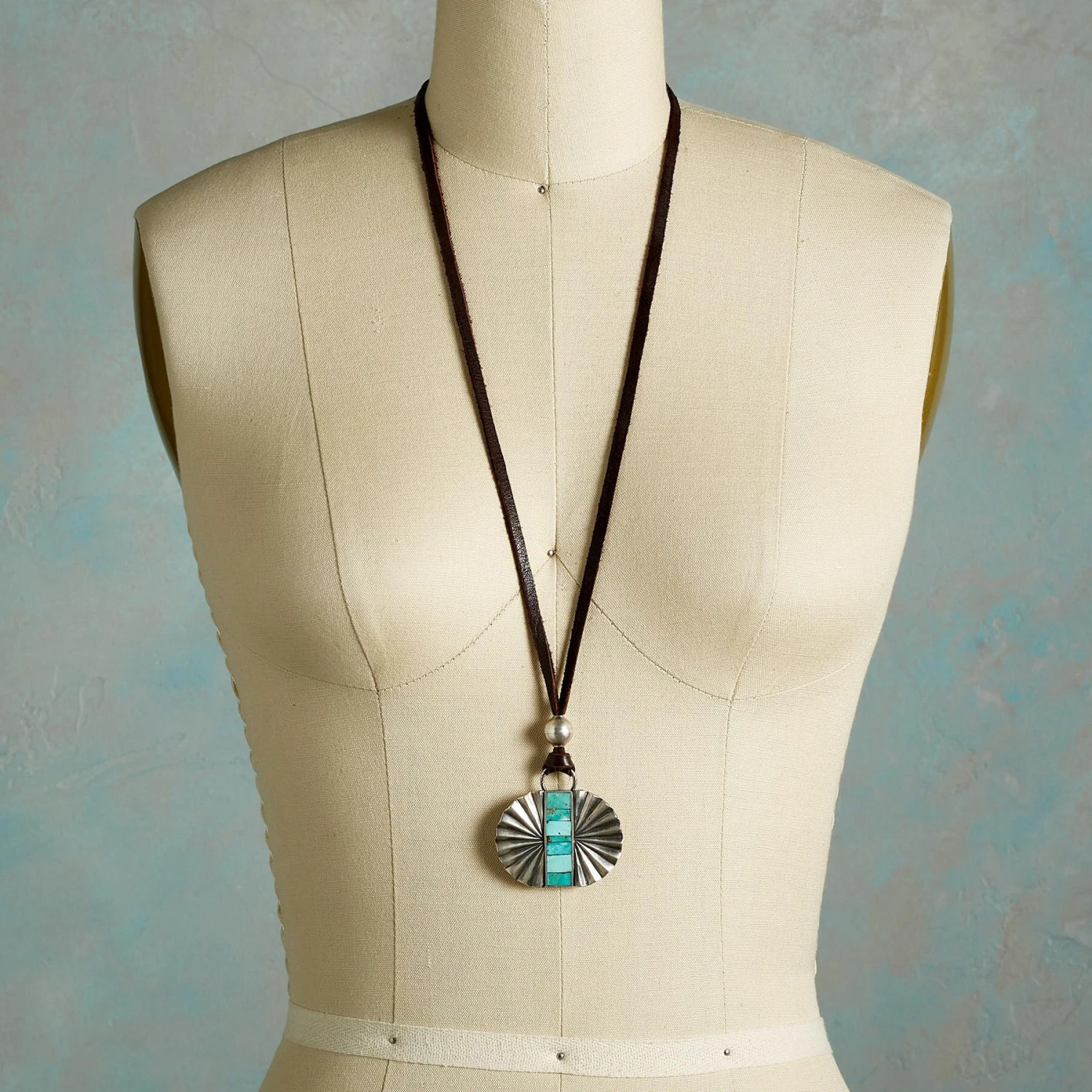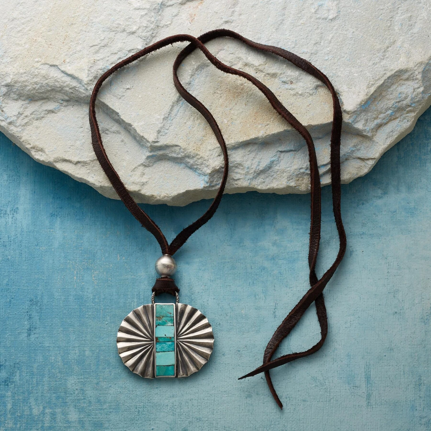 Jesse Robbins sets hand-cut tiles of sky blue Cheyenne turquoise between sterling silver fans that evoke the sun’s rays. Handmade in USA. Exclusive. 28″L, 2″ dia. pendant.